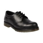 Black smooth leather safety shoe. Padded collar for added comfort. Steel toe cap protection. Moisture wicking inner lining. PVC air cushion outsole. A lightweight uniform safety shoe for lighter duties, factory or warehouse type work.